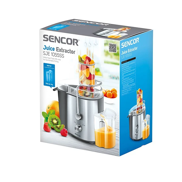 آبمیوه گیری سنکور مدل SJE 1055SS یکی از مدل های بسیار با کیفیت و حرفه ای برند سنکور است، این آبمیوه گیری با موتور قدرتمند خود و تیغه های تیز از جنس استیل ضد خش و ضد زنگ میتواند در کوتاه ترین زمان ممکن میوه مورد علاقه شما را با بهترین کیفیت ممکن آبگیری نموده و در هر ساعت از شبانه روز، یک لیوان آبمیوه طبیعی و خوشمزه را برای شما فراهم آورد، این آبمیوه گیری به یک موتور 800 واتی مجهز است، این موتور طول عمر بسیار بالایی داشته و میتواند سال ها بدون خرابی کار کند، همچنین صدای بسیار پایینی در هنگام کارکرد تولید میکند، شما میتوانید قدرت موتور را در 2 حالت سرعت 12600 و 10600 دور در دقیقه تنظیم نمایید، البته قابلیت حرکت پالس نیز در اختیار شما قرار دارد، آبمیوه گیری سنکور مدل SJE1055SS به شکلی طراحی شده که میتوانید تمامی قطعات آن را از همدیگر جدا نموده و در ماشین ظرفشویی مورد شستشو قرار دهید