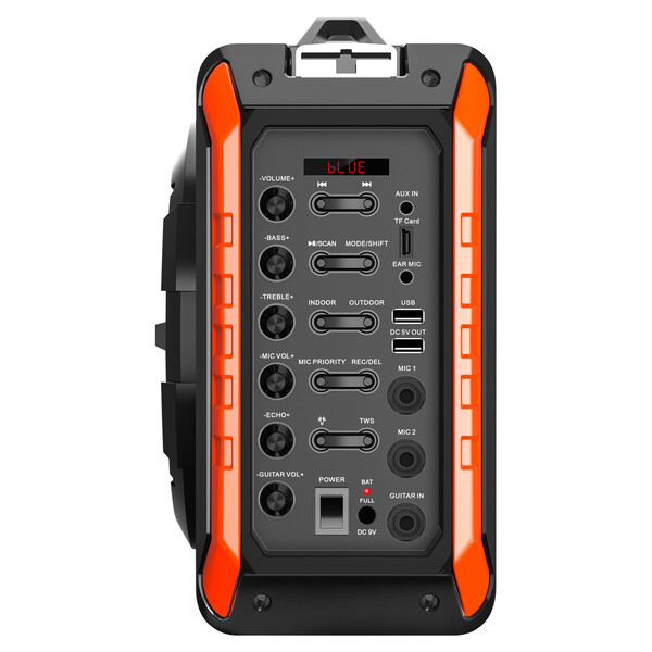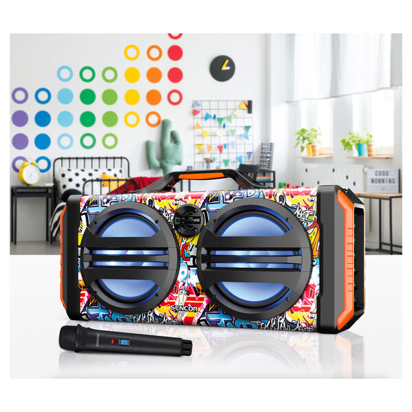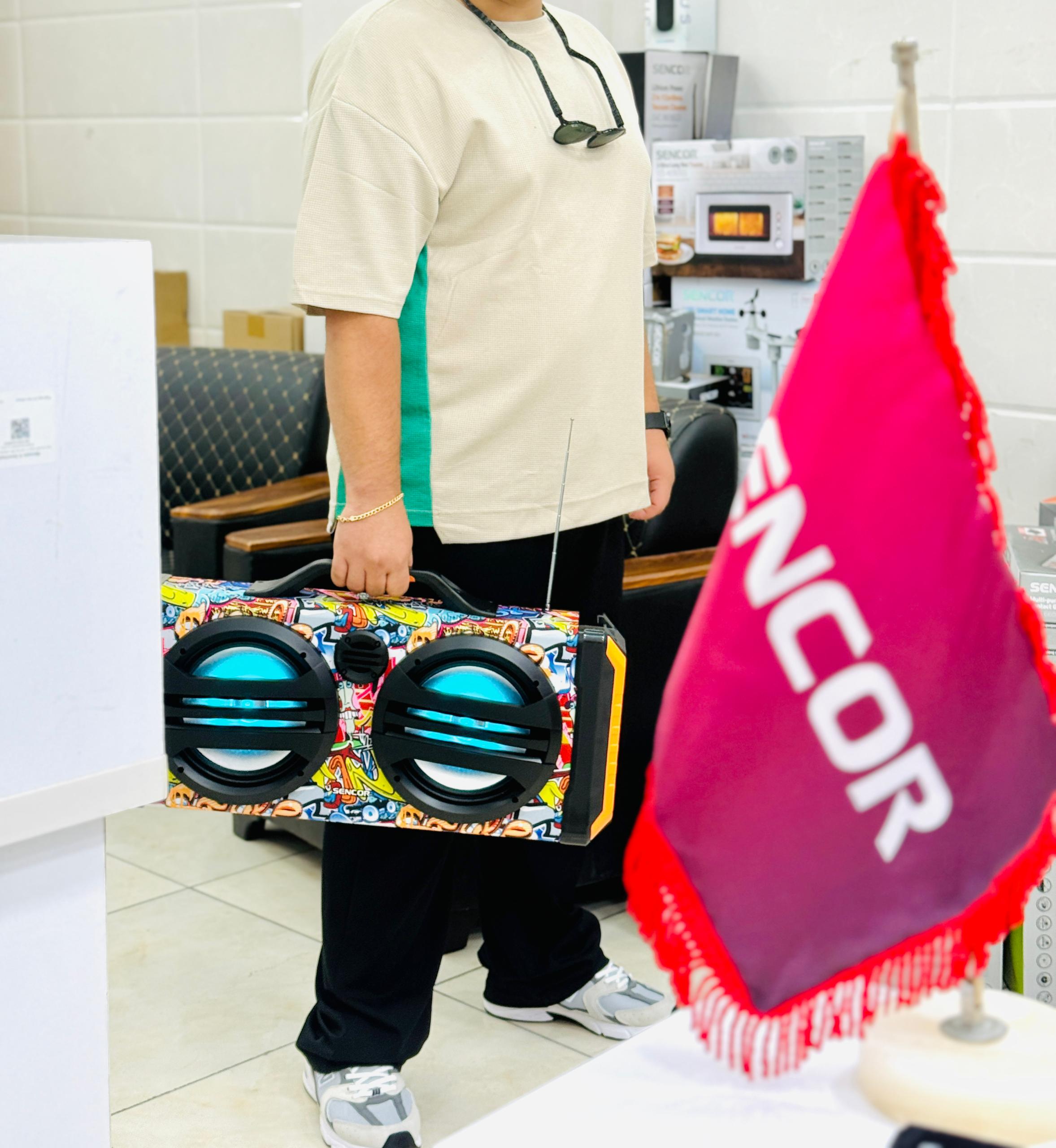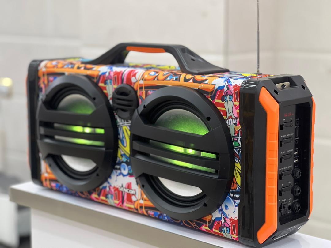 اسپیکر sss3900 برند سنکور مناسب برای مهمانی ها . میکروفون بی سیم گنجانده شده است کارائوکه با قابلیت ضبط چراغ های LED چند رنگ چشمک زن باتری قابل شارژ داخلی میکروفون بی سیم فاصله تا 10 متر باتری میکروفون: نوع AA (شامل نمی شود) زمان کار تا 4 ساعت عملکرد ECHO صدا: توان خروجی: 100 وات (امپدانس: 4Ω) پاسخ فرکانسی: 100 هرتز – 20 کیلوهرتز اعوجاج هارمونیک کل: ≤1٪ 3 بلندگو (2 میان رده + 1 تربل) ورودی‌های حالت صدا: بلوتوث صوتی 5.0 فاصله اتصال تا 15 متر ورودی صوتی (جک 3.5 میلی متری) ورودی USB اسلات کارت MicroSDHC 2 عدد ورودی میکروفون (جک 6.3 میلی متری) ورودی گیتار (جک 6.3 میلی‌متری) سایر موارد: TWS – استریو بی‌سیم واقعی رادیو FM PLL نمایشگر LED کارائوکه با عملکرد ECHO و تنظیم صدا باتری داخلی: 4000 میلی آمپر ساعت لیتیوم یونی زمان پخش باتری تا 10 ساعت (50 درصد سطح صدا) شارژ 9 ولت (نشانگر LED) پورت شارژ USB خروجی کمکی (مونو) لوازم جانبی: آداپتور شارژر (DC 9 ولت، 1 آمپر)، میکروفون، کمربند پارچه ای برای حمل، کابل 3.5 میلی متری Aux، دفترچه راهنمای کاربر ابعاد: 630 × 300 × 160 میلی متر وزن: 5.5 کیلوگرم