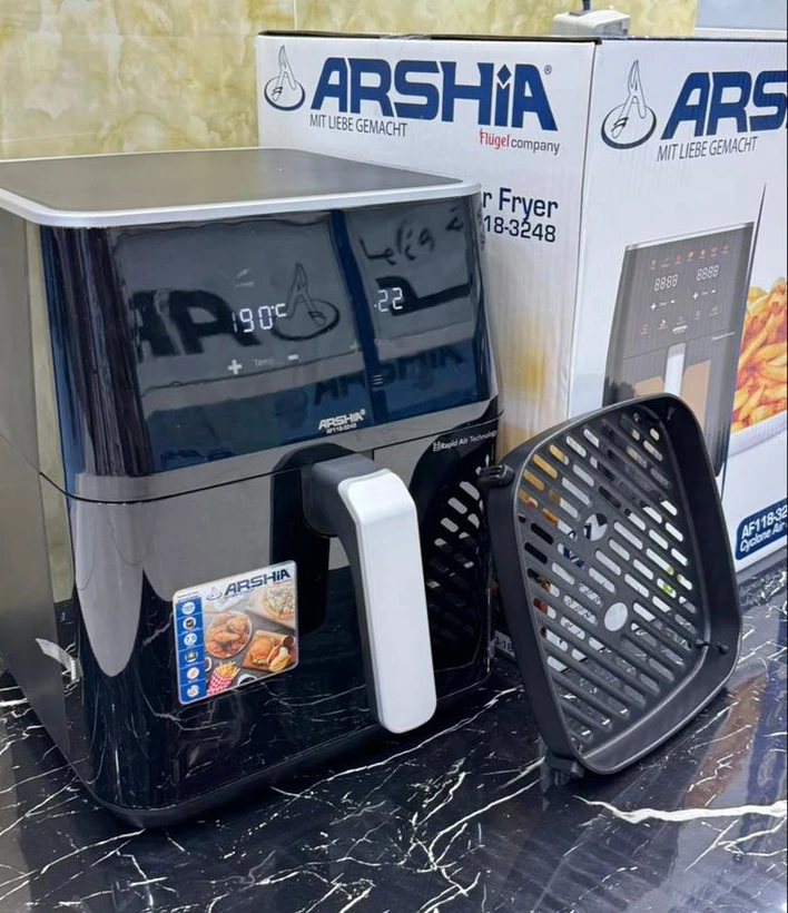 سرخ کن بدون روغن عرشیا مدل AF118-3248 با ظرفیت بزرگ ۷.۵ لیتر، گزینه‌ای ایده‌آل برای مصارف خانگی است. فضای کافی برای تهیه غذاهای خوشمزه برای خانواده و دوستان را فراهم می‌کند. درب شفاف به شما امکان می‌دهد تا در حین پخت بر غذا نظارت داشته باشید و هر بار نتایج عالی بگیرید.یکی از ویژگی‌های برجسته این سرخ کن، قابلیت پخت بدون روغن است که آن را به جایگزینی سالم‌تر برای روش‌های سرخ کردن سنتی تبدیل می‌کند. طراحی کاربرپسند آن کاربری آسانی را برای آشپزهای مبتدی و حرفه‌ای به همراه دارد. این سرخ کن با ولتاژ ۲۲۰-۲۴۰ ولت و فرکانس ۵۰-۶۰ هرتز و توان ۱۵۰۰-۱۸۰۰ وات، عملکردی کارآمد برای برآورده کردن نیازهای آشپزی شما ارائه می‌دهد.سرخ کن بدون روغن سایکلون Arshia مجهز به فناوری گردش سریع هوا، پختی سریع و یکنواخت را تضمین می‌کند و بدون روغن اضافی، نتایجی ترد و طلایی به شما می‌دهد. استفاده از آلومینیوم ۱۰۰% قابل بازیافت، دوام و پایداری را تضمین می‌کند، در عین حال عاری از سرب، کادمیوم و PFOA است و ایمنی غذا و آرامش خاطر را برای شما و عزیزانتان به ارمغان می‌ آورد.