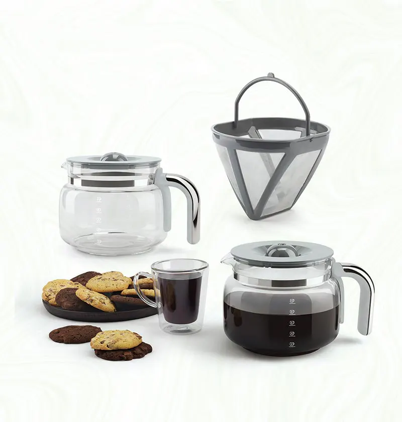 قوری بسیار زیبای این قهوه ساز گنجایشی برابر با 10 فنجان قهوه را داشته و دارای بدنه مندرجی می باشد که می تواند میزان دقیق مایع درونی را برای شما مشخص کند. همچنین سیستم کنترل در این قهوه ساز به صورت دکمه ای بوده و دارای نمایشگر LED می باشد که این محصول را کاملاً خاص و لاکچری کرده است. در ضمن فیلتر استفاده شده در قهوه ساز آبی پاستیلی اسمگ از جنس استیل و پلاستیک بوده و قابل تعویض است.