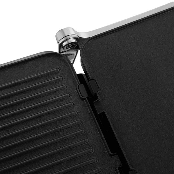 صفحات گریل این مدل قابل تعویض هستند و می‌توانید بسته به نوع غذا از صفحه صاف یا صفحه رگه‌دار استفاده کنید. صفحه صاف برای سبزیجات، پنکیک و غذاهایی که نیاز به سطح یکنواخت دارند ایده‌آل است، در حالی که صفحه رگه‌دار ظاهر جذاب و خط‌دار مخصوص گریل را به استیک، مرغ و همبرگر می‌بخشد. همچنین سینی جمع‌آوری چربی قابل جدا شدن، چربی اضافی غذا را جمع‌آوری می‌کند تا پختی سالم‌تر و تمیزتر داشته باشید.